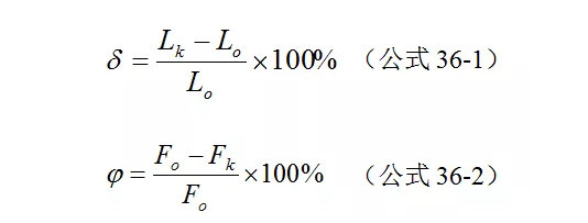 式中:L0、Lk——拉伸試樣原始標(biāo)距、破壞后標(biāo)距的長(zhǎng)度。F0、Fk——拉伸試樣原始、破斷處的截面積。